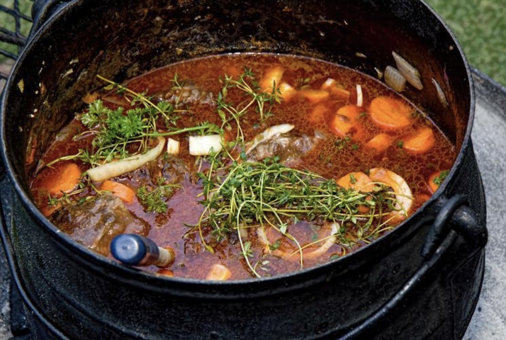 To reduce sand & grit, in bottom of pan, soak the clams in water 4 times in sink about 15 mins. each. Fully drain water & rinse after each soak. In a large stock pot, add 2 qt. water & all the clams. Put on high heat & bring to boil, reduce heat & wait for the clams to open. Take clams from their shells & set aside; discard the shells. If any clams did not open, throw them away. In the same stock, add butter & vegetables & sauté. Add herbs & tomatoes. Add clam broth & bring to boil. Reduce to simmer & cook 30-40 minutes until the veggies are cooked. Add the clams back into the chowder & season to taste. Recipe: Nancy Armitage & Kathi Davis