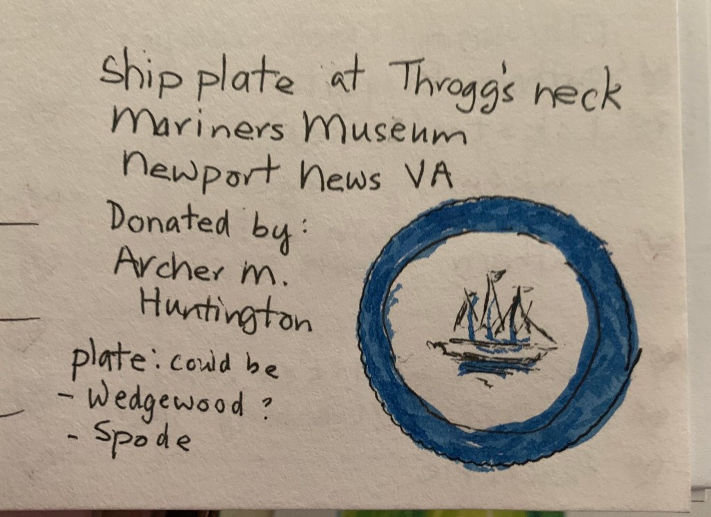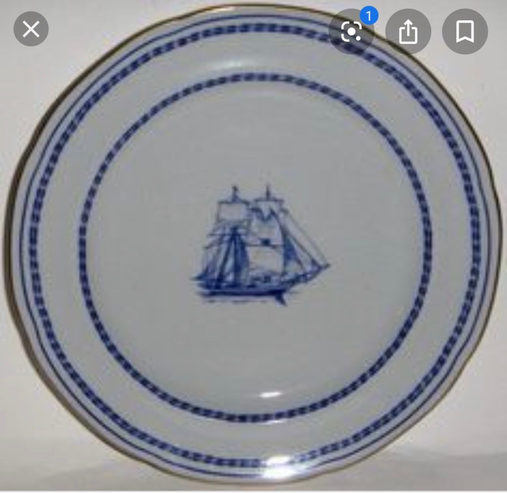 At the Mariner’s Museum in Newport News, VA, which was founded by Archer Huntington (with 1000’s of nautical items of the Huntington Family and their shipping lines). I found a fine bone china pattern that could have been used at the Huntington’s Throggs Neck estate. It was a nautical Clipper ship dinner plates ( blue & white), donated by Archer Huntington after Arabella Huntington death in 1924.