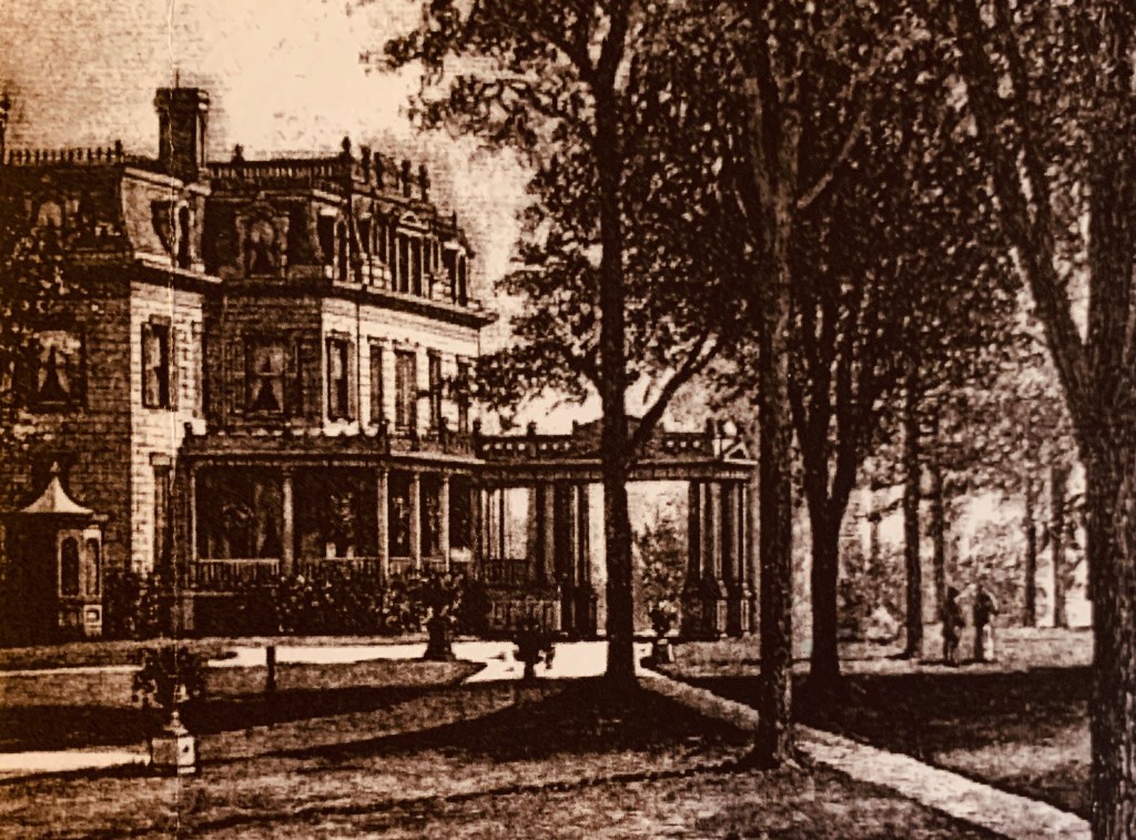 The Collis & Arabella Huntington’s “Homestead” expansive estate had a Victorian Gothic Mansion situated on an amazing 400 acres – later 800+ acres. I was so excited to find this image of the Huntington “Homestead” mansion in the Book: The History of Westchester by John Thomas Scharf. This Huntington mansion is now located on Schurz Ave in Throgg’s Neck, Bronx, NY 10465. Their property would have been considered their country estate, used on the weekends & especially in the summertime.