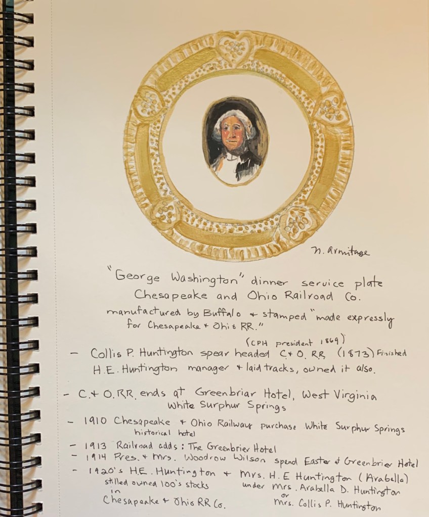Also, I found in the Chesapeake & Ohio Railway Co. archives a stunning “George Washington” gold plate. This is no ordinary plate, it is a large ornate dinner plate/charger plate with a thick gold (probably 24K) rim; in the middle of the plate, a fine portrait of George Washington. On the back of the plate in the middle, states “C&O RR Co. Railroad”. These patriotic plates were used on the C & O Railroad which the Huntington Family actually built that railroad, too. Collis & H. E. “Edwards” built that railway together, hosting presidents, royalty, & often traveling from NYC to Washington DC. Could Mrs. Collis Huntington (Arabella) have ordered some these handsome plates for her own “State Dining-Room” in her mansion in the city of New York City or Throgg’s Neck mansions??