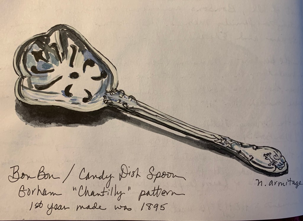 In Mr. Huntington’s Bill “Personal Ledger”, throughout the year in 1912, there were monthly & bi-monthly entries for flower arrangements & roses. There were charges from $70.00-160.00 at Chas. Thorley, a florist in New York City. There were Tiffany & Co. bills for jewelry for $100.00 to $1,320.00 bills. From the famous Louis Sherry restaurant in NYC: he bought jellies & cherries, pastries, & “c” for cake or teacake. From a confectionery named “Huylers Chocolates and Confections” in NYC he bought 1 lb. each: Chocolate bonbons & peppermint bonbon candies. Dec. 1912, he purchased from Cartier “a diamond fan” (Delivery & gift wrap) for $380.00. Also, included were several florist entries & from M. Lawrence & Comstock Co. for “Apricot Cordial”.