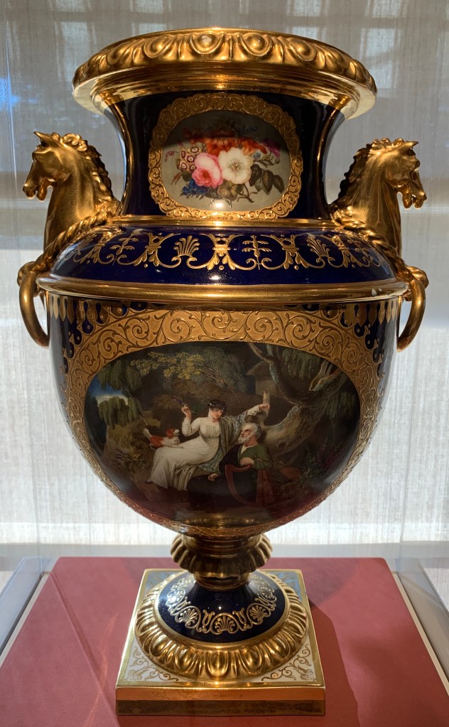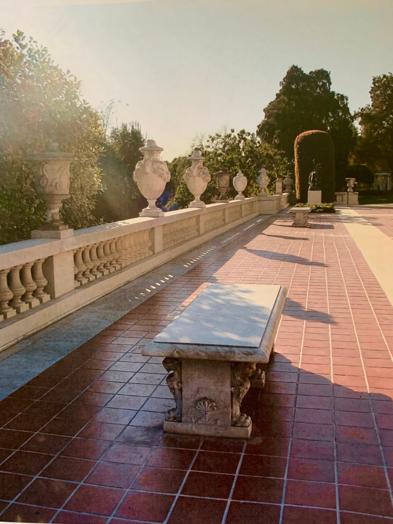 The Huntingtons had a great affection for horses. Mrs. Arabella Huntington raced her horses on the East Coast, at Saratoga Springs, NY. The fireplace of the Small Drawing-Room located on the north side of the room, featured 2 bronze Dore andirons in the shape of mounted horses. On the mantle, sat a Louis XIV gold Dore porcelain mounted calendar clock (by Sotain worth $28,000.00 in the 1920’s). It had a handsome pair of “Louis XIV bronze figures of prancing horses (16” high with an applied ormolu saddle cloth, strap work & rosettes, mounted on sarcophagus-shaped pedestals mark of Boreas). These were bought by Mr. Partridge for Mr. Huntington on December 26, 1913, shortly after the Huntingtons married; maybe for a Christmas present. On cold winter mornings, the parlor maid would have made a nice cozy fire. On sunny afternoons, the Small Drawing-Room would have been warmed by the sun. Later in the day, the Huntington’s could enjoy the sunset streaming through the window past the Rose Garden.