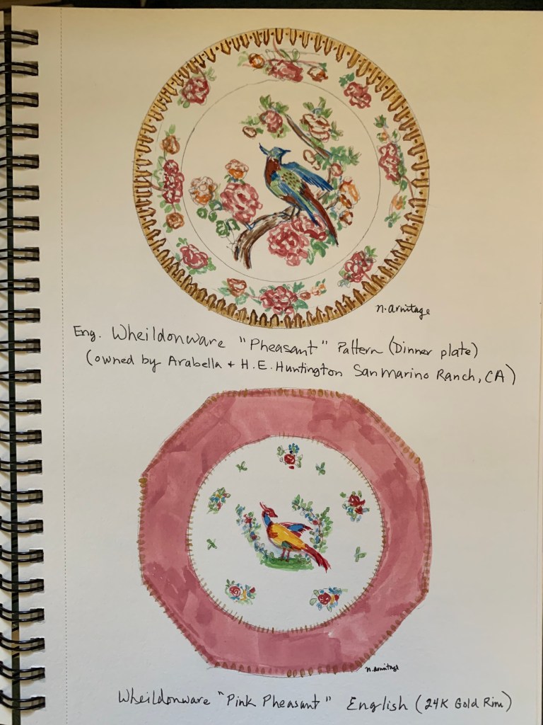So it was decided (probably by Belle) that the Huntingtons would receive their meals in the Formal Dining- Room. The Huntington’s – “Belle & Edwards” loved breakfast. They used to comment how, Alfonso Gomez, the Head Butler, used to make the Huntington’s homemade orange juice everyday! Of course, these fresh oranges came from the Huntington’s orange groves. They would wake up to the smell of freshly roasted French Coffee. They were also served a variety of breakfast items through the week. All kinds of different Eggs dishes: Steak & eggs, French omelettes, even Huevos Ranchos or a French crepe (savory or sweet). They had Bacon, Sausage links, or Canadian Bacon with potatoes, They were served Tutti-Fruitti & Fruit Compotes & Brandied Peaches; served in pretty “Elite Haviland” footed “compote bowls”. The French Haviland footed bowls/plates were white & gold with some with pink roses. They had toast with Ranch Orange Marmalade from the oranges on the San Marino Ranch. In my opinion, the Huntingtons like their formal Dining-Room, to have breakfast there just made sense. So the corner room once called “the Breakfast Room” became the “Small Drawing Room” for Mrs. Huntington’s lovely intimate teas.