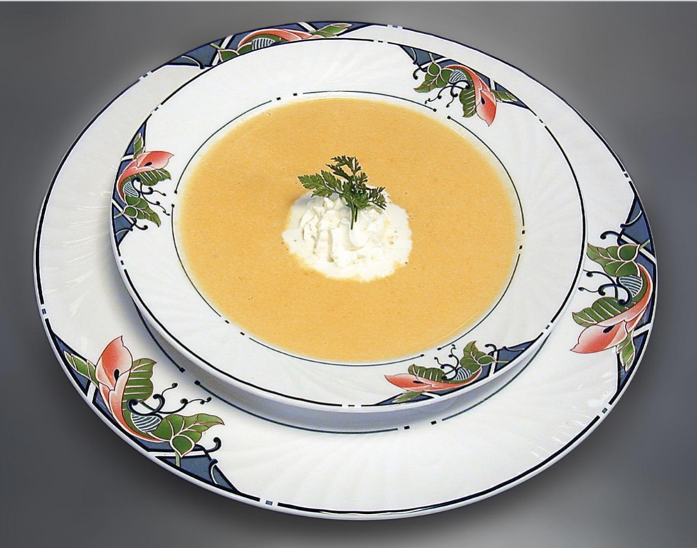 Soups were eaten twice a day at the Huntington Mansion: for formal luncheons & for formal dinners. So there was always soup being made in large stockpots in the Huntington kitchen; the cook(s) also had to fed the servant staff & house employees (12-20 people). There would have been winter vegetables from the 2 large Ranch Vegetable gardens. Winter veggies were Spinach, Broccoli, Brussels Sprouts, Kale, & Cauliflower. In February, the kitchen could have made a hearty warm soups like, French Cauliflower Soup, Spinach Soup, “Potage St. Germain” (Split Pea Soup recipe from Paris), or a hearty Beef & Barley with Veggies Soup. Soup was always presented with soup bowl, some had with 2 handles, placed on a doily- lined large plate, then decorated with a dopple of creme fraiche and a sprinkle of chopped chives or herbs on top.