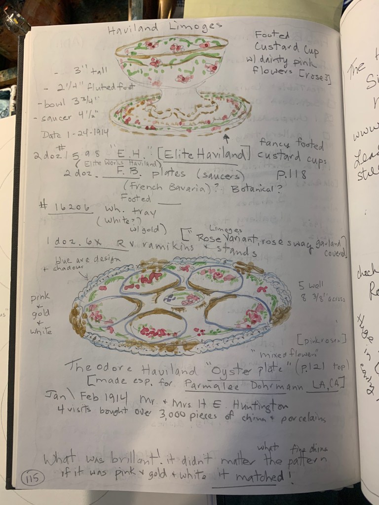 On January 24, 1914, Mr. & Mrs. H. E. Huntington went to downtown LA & visited Parmalee Dohrmann store & had a shopping spree of fine plateware (over 1000 pieces) . At that time, they purchased 2 doz. Elite Haviland fancy foot custard cup/compote bowl & saucers probably to use for the occasion of serving tutti-frutti or a seafood cocktail. The Huntingtons often had a fruit compote for breakfast, also. These charming raised Haviland vessels would have been perfect & beautiful, too.