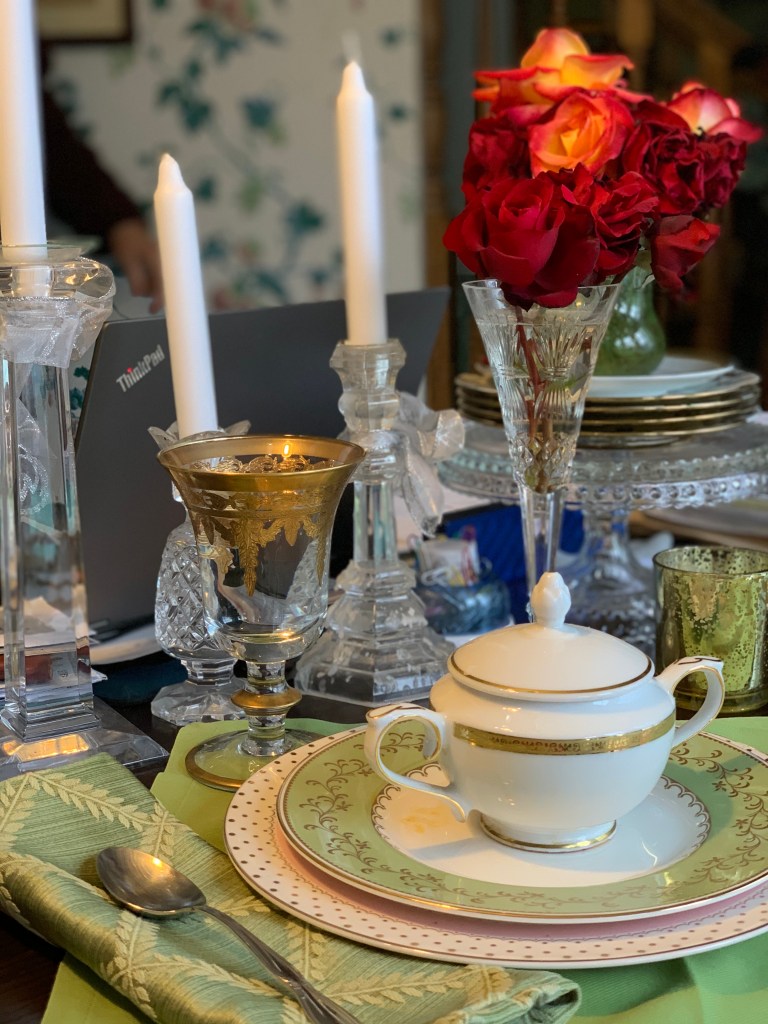 The words, Service a’ la Russe is a French term, meaning “service in the Russian style”, courses served one at a time. A Russian King introduced this method to the French Kings. This dramatic change made hosting dinner parties & going out to dinner an elegant affaire. Each morsel of tantalizing food was made to savor & be enjoyed with a marvelous sip of wine or French champagne. They called each guest dinner plate, ” a cover” neatly placed on a fancy Charger Plate. These where placed on the Dining Room table with fancy damask fabric napkin. Each cover included numerous plates of fine bone china/porcelain, including butter plate, poultry plate, salad plate, fish plate, entrée or dinner plate, dessert salad, cheese plate with soup bowl, too. Glasses & goblets of fine crystal ware for claret Victorian red wine like Claret or Burgundy & white white like Chablis, champagne, sherry, & water glasses provided. Also, various silver flatware provided such as fish forks, entrée fork, seafood fork, fish knife & entrée knife also a butter knife, pudding spoon & soup spoon & many more. Some tables also graced each guest with a place card with their name & individual small silver salt cellars & pepper shakers & a finger bowl (to wash one’s hands if needed).