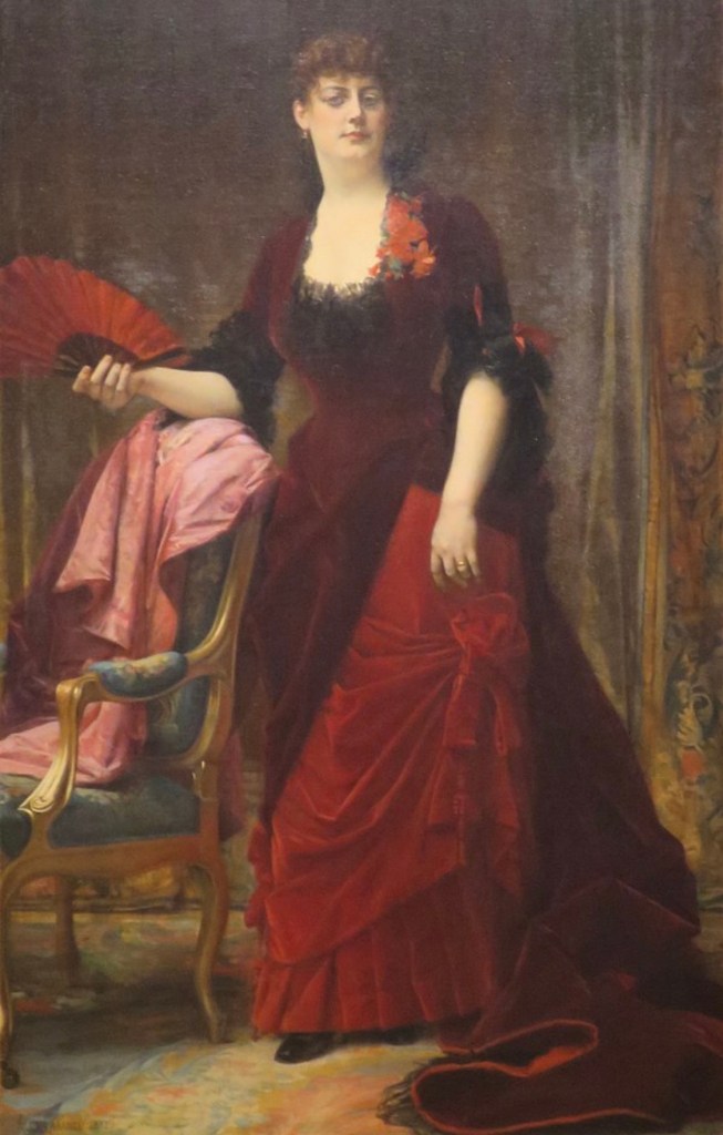 The paintings or “pictures” that Mrs. Collis P. Huntington (Arabella D. Huntington) sat for a portrait – how many were there? maybe 4-6 or more paintings. In her San Francisco mansion, we know that 4 portrait paintings were in that mansion. We know that one of them was Mrs. Collis Huntington life-sized portrait. She is in the red dress with many layers & black lace decoration (above). Arabella is holding a pink Victorian fan & she is standing next to a light blue & pink needlepoint French chair & pink wrap.