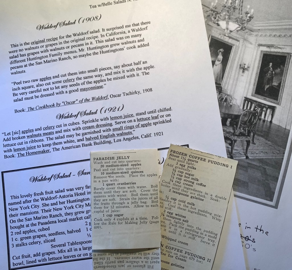 then for the 2nd half of the grand dinner: a Game Course (Duck a la Orange or Pheasant), Salad Course (served French style after the Entrée like refreshing Waldorf Salad or California Avocado & Orange Salad, a Cheese course (Mrs. Arabella Huntington loved French cheese: “Fromage course” using Roquefort, Brie, or Camembert, served with water crackers. Desserts could be Royal Pudding or Fancy Cakes & shaped Ice cream, Dried Ranch Fruit like Apricots & Cherries or fresh Mango & Peaches with Nuts to finish, with Bon Bons or Jordan Almonds ( French Chocolate Truffles with Coffee or After-dinner drinks served in the Large Drawing-Room).