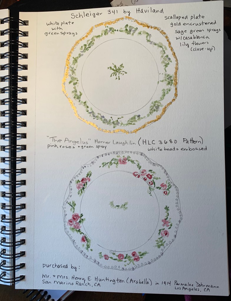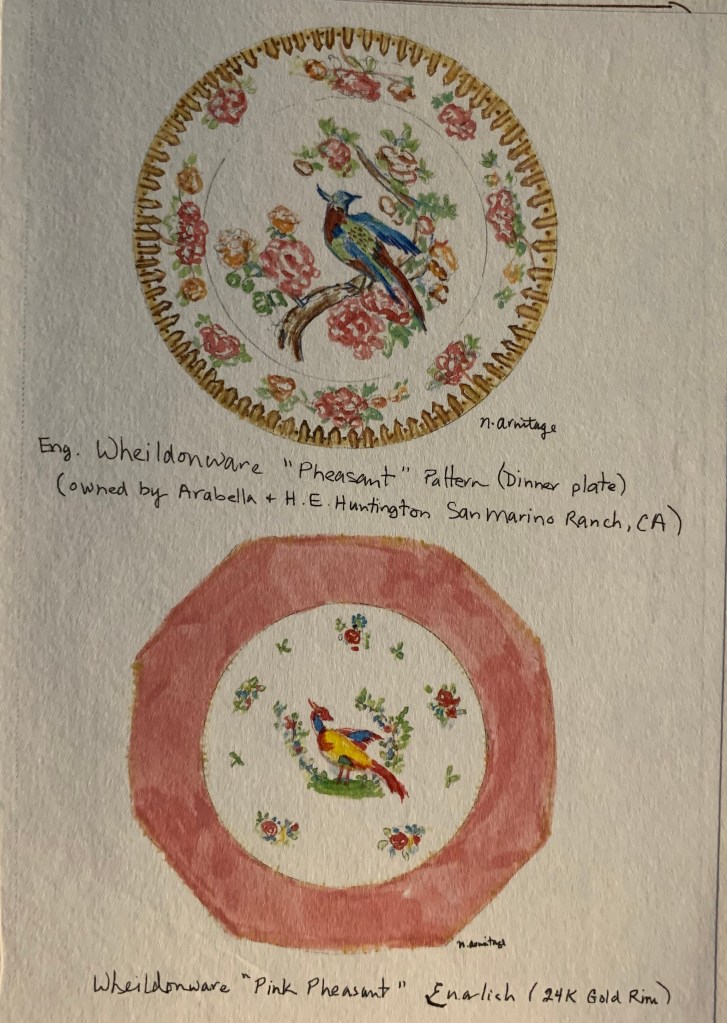 A popular thing to do for hostesses was to have the family crest or family initial “H” painted gold on fine china plates. Bullocks, a local fine department store in Pasadena, (which is now Macys on Lake Ave.), use to have this service. The font for the family initial(s) was usually Old English or Gothic type in gold & very elegant. When Mrs. Huntington died in 1924, Archer Huntington would have inherited her “bric-a brac”. When Mr. Huntington died in 1927, his 3 daughters would have inherited all his treasures except for the all his treasured books and document collections, master paintings & the tables under the paintings. His son, Howard Huntington died in 1922.