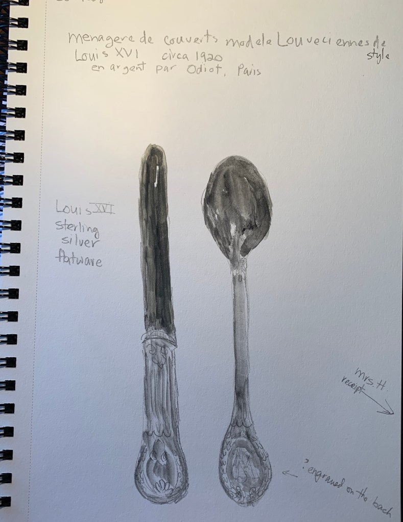 Marie Antoinette adored pretty French plates, Sevres, Haviland, & Limoges, too. There is a lovely Limoges pattern is a super simple called “Marie Antoinette”, it is a scallop white plate with a gold ribbon on the rim & edge. Mrs. Huntington had several pattern of gold & white plates she used at the San Marino Ranch.