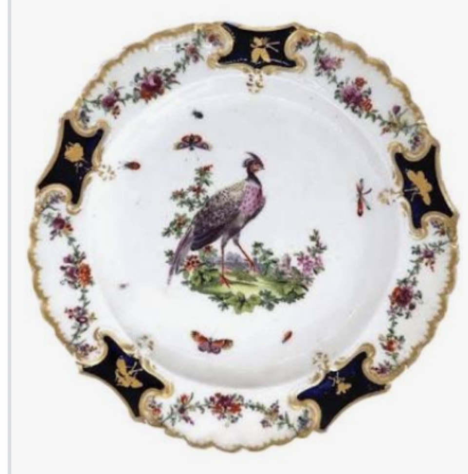 This huge Mecklenberg table service of Chelsea was ordered thru Duveen Bros. from H. E. Huntington as a gift for his wife (probably for Christmas) in Oct./Nov.1923. It was comprised of 4 candelabras, 1 Epergne, 2 oval soup tureens, 65 Meat plates, 30 soup plates, 5 Dessert plates, 6 salt cellars, 5 sugar castors & covers 4 Double cruet frames and 1 circular dish. Each dish had a different botanical bird in the middle with swags of roses in between the blue shields. These plates were used at H. E. & Arabella Huntington’s Mansion at No. 2 East 57th Street in New York City, NY. Arabella often collected items of royalty: plates, jewelry, etc. Document: Rare book #425016 Catalog from NYC Anderson Galleries, 1926 auction from Huntington mansion in NYC. Found at Huntington Library, San Marino, CA