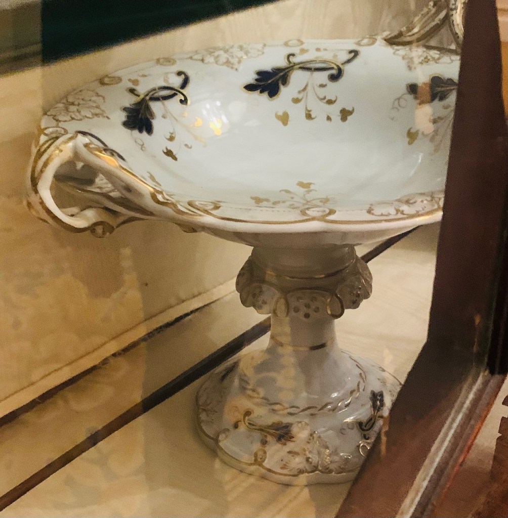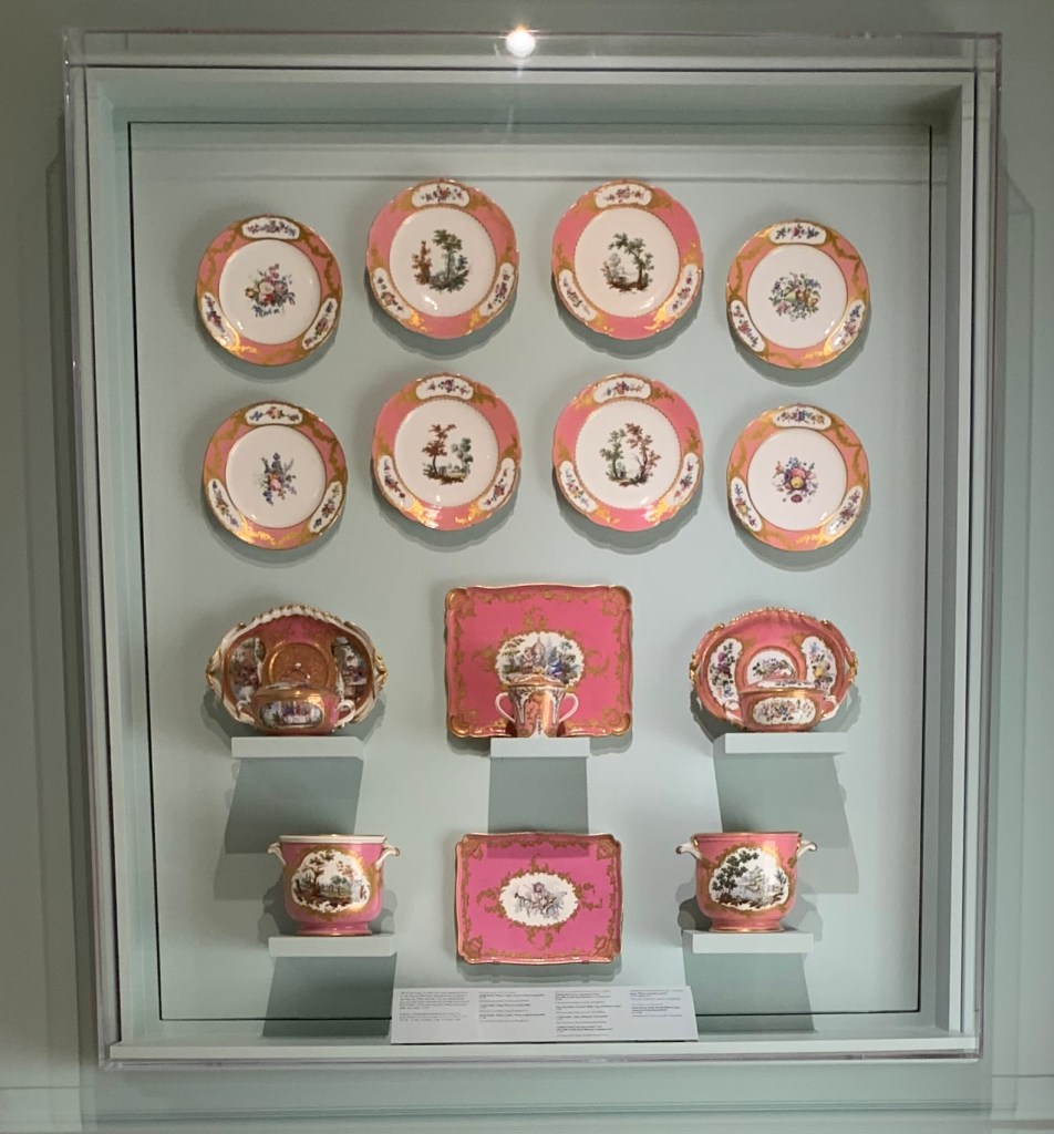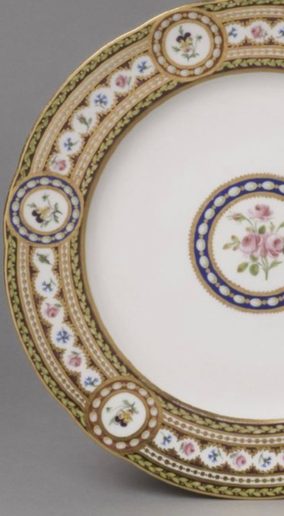 These French Sevres Dinner Service Sets come had many pieces: vegetable tureens, soup tureens, footed compotes, teapot & coffee pot, chocolate pot, champagne canister, & so much more. It was fine bone porcelain Sevres Meissen Buffon Bird in the middle; often decorated with gold & pink roses &/or swags of roses. Most of her fancy plates & porcelain vessels came out of the Sevres factory. I have seen a version of Sevres with pink rose swags & they call it “Meissen Buffon bird”.