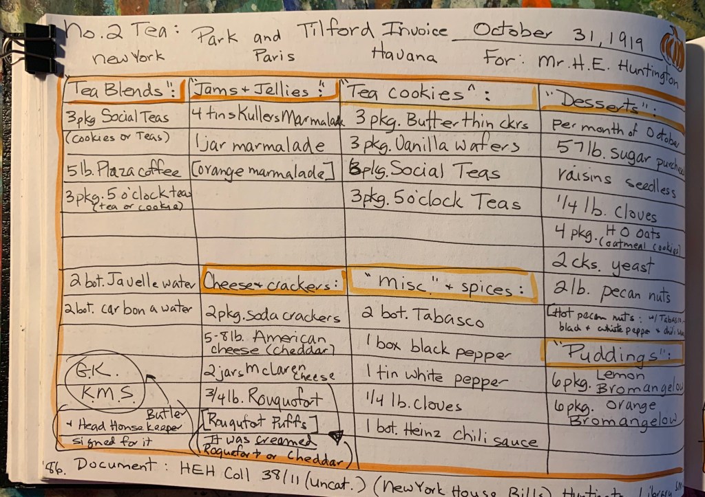 From Document: HEH Collection HEH 38/11 (HEH’s New York Mansion bills) at the Huntington Library; Gourmet foods from Park & Tilfords NYC: Tea party foods, oatmeal cookies, Social tea cookies, tea & coffee, cream scones with orange marmalade, Roquefort cheese, & McLarens Sharp cheddar & McLarens Roquefort spread from Canada.