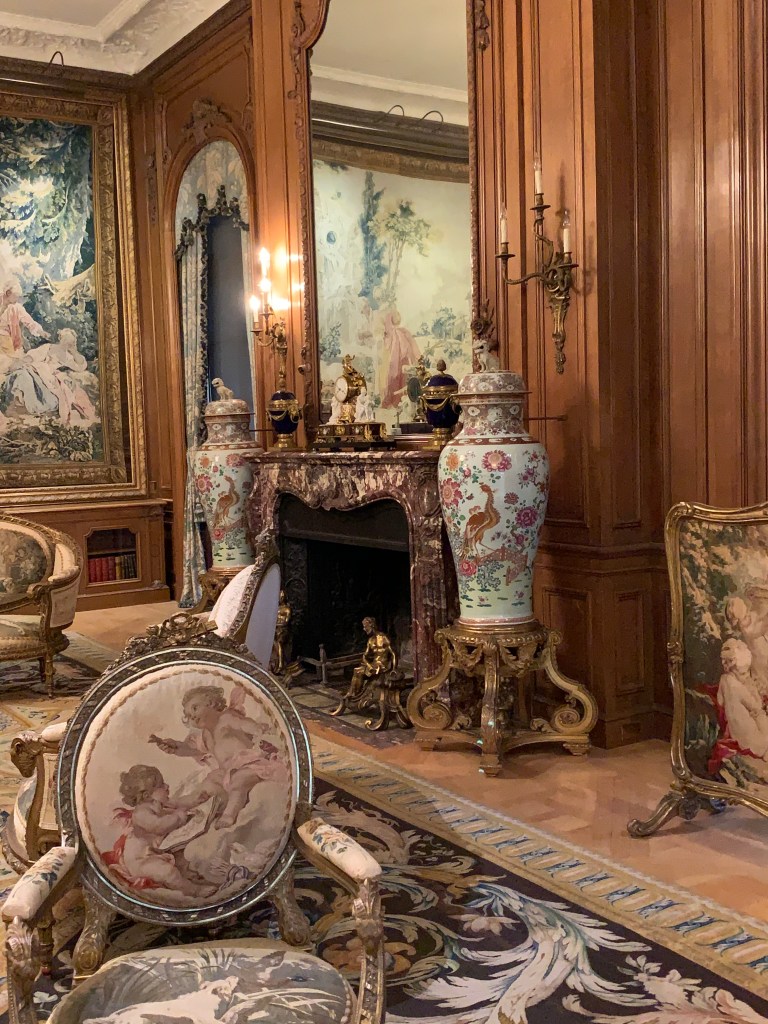 On the fireplace mantle was a beatiful French Louis XV Clock, Philiberts, decorated with two marble groups, Venus & Cupid. Large vases were placed on either side: 2 Chinese vases, very tall 50″ high & 2 vases by Clodion. In the Huntington’s day at this mansion, there would have been beautiful fragrant roses & flowers everywhere in this room. Always fresh flowers from the Ranch’s rose garden and Mrs. Huntington’s flower garden (located west of the Huntington tea room). Mrs. Huntington love fragrant roses & flowers especially pink & white. An impressive description tells the Royal French history of the Clodion vases: 2 marble vases by Clodion (1782) bought by Seligmann on Sept. 5, 1912 Paris Collection; late Baron Adolphe de Rothschild in Pregny (Switzerland). The vases were made for the Chateau de Versailles & they are known as the “Chef d’oeuvre of the Master.” The vases had an antique shape with sides that were two heads of rams & vine branches & medallions 3-4 personages, nymphs, & satyrs erecting a statue to god Pam, & signed & dated fauna & fauness pipe teaching children how to dance.