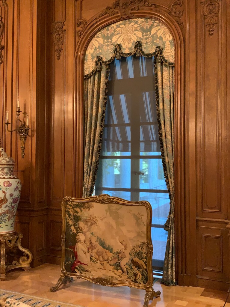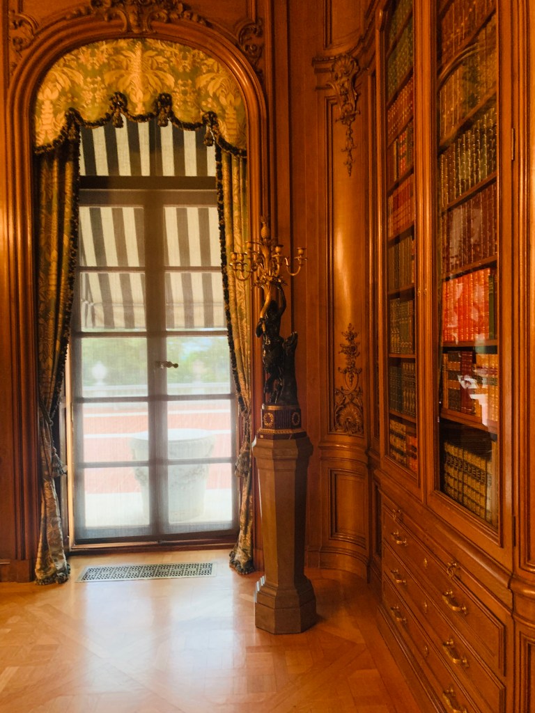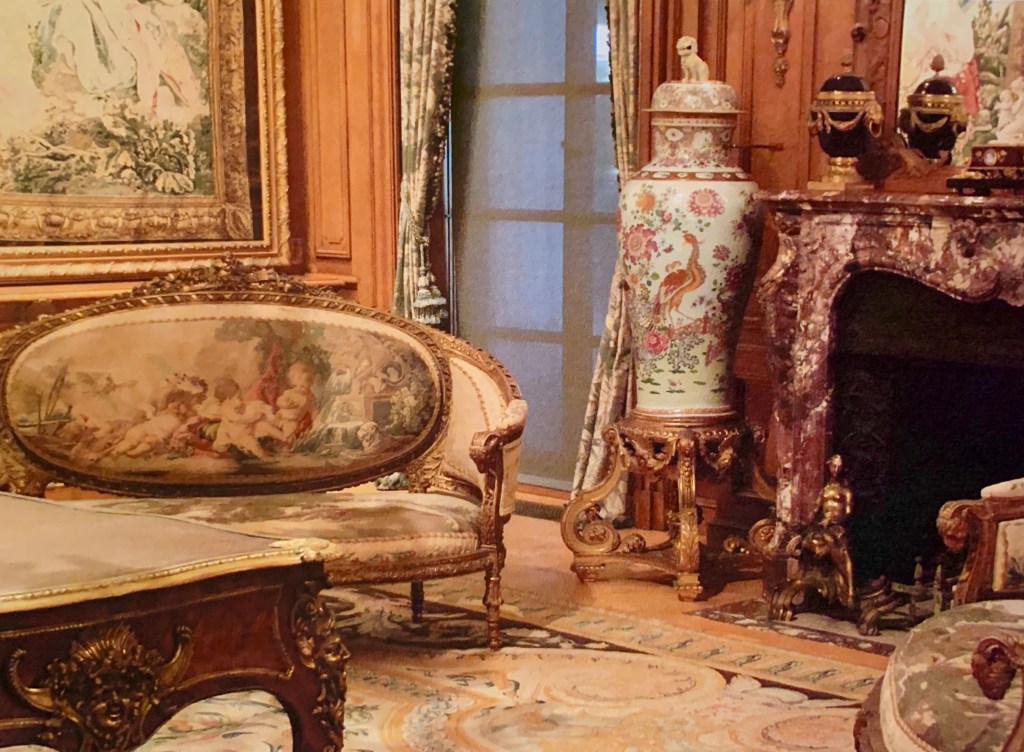 The Large Library was decorated in the elegant French Louis XV style with lovely romantic overtones. The room’s color palette was green & gold with a touch of blue. On the six large windows, hung 6 sets of heavy green satin curtains, surrounded by warm oak wood book shelves. In front of the fireplace lay an Oriental rug (16th Century Ispaham Persian rug) valued at $15,000.00 in 1927.