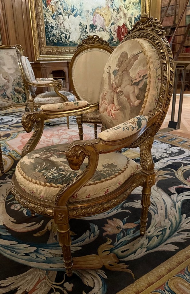 There was an oval Louis XV table & stationery cabinet for writing letters. Mrs. Arabella Huntington was not fond of writing letters, thinking her handwriting was too messy. She employed her friend, Miss Caroline “Carrie” M. Campbell as her social secretary. Carrie was one of the Huntington’s entourage of employees & servants that traveled from Huntington mansion to mansion with the Huntingtons. Carrie would write letters for Mrs. Huntington, also she create handwritten dinner menus & wrote out guest names on place cards because she had beautiful handwriting.