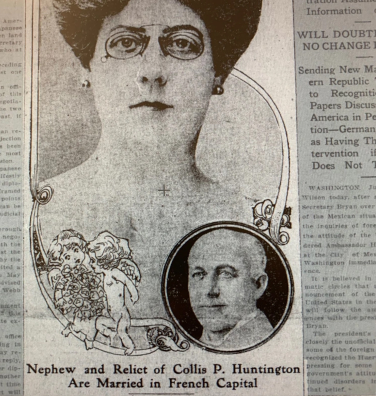 True: Collis P. Huntington (B. 1821) & Mrs. Arabella “Belle” Yarrington Worsham (B. June 1, 1850) were husband & wife. They got married in 1884 in NYC. Collis P. Huntington died in 1900, so they were married for 16 years. In society, she still remained: “Mrs. Collis P. Huntington” until she married Henry Edwards Huntington in 1913. Always, signing her name Mrs. Arabella D. Huntington.