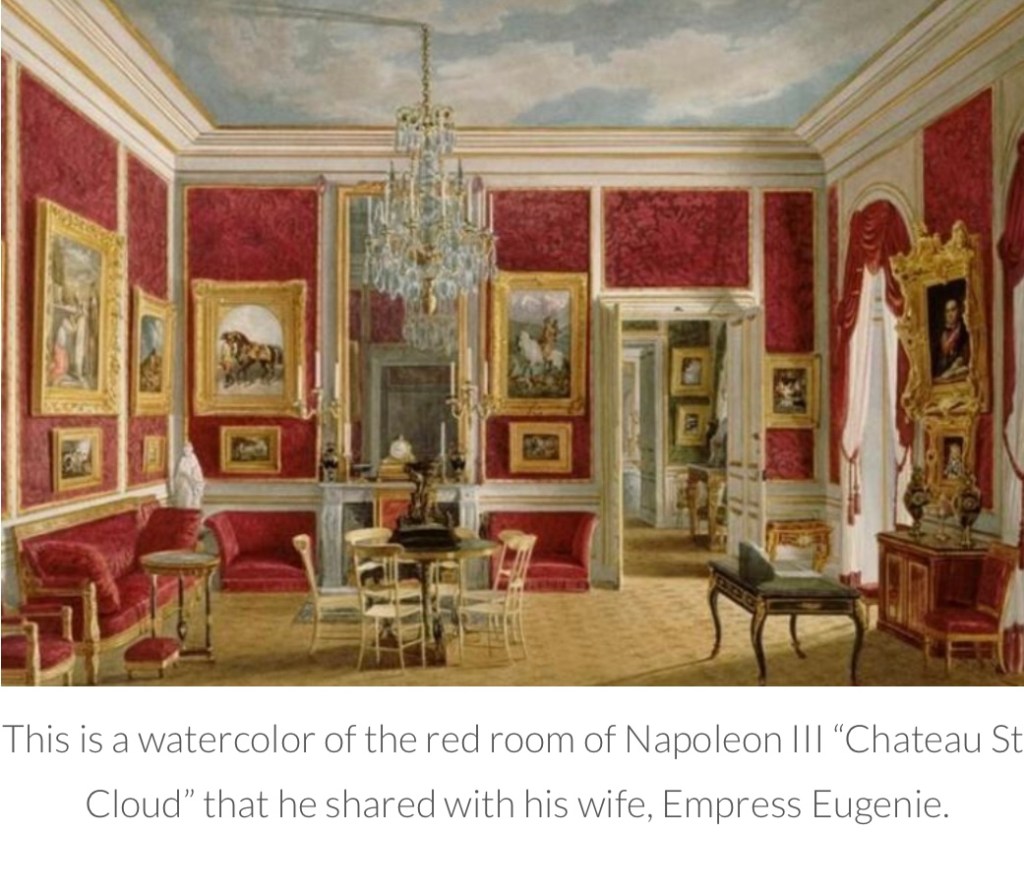 Napoleon III & Empress Eugenie owned the grand Chateau St. Cloud in Paris. A beautiful red watercolor of her red damask wallpaper in salon or a drawing room. They appreciated many paintings with numerous paintings on the walls of this salon.
