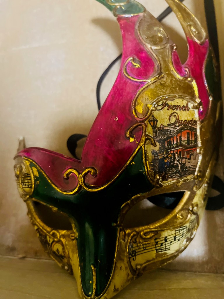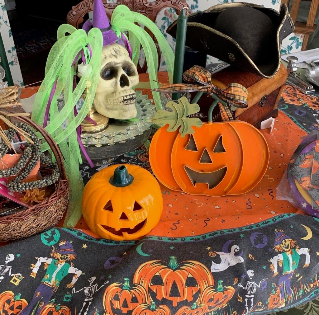 The grand Halloween Dining-Room table could have been decorated in fancy gold damask tablecloth & napkins or a Medieval Autumnal-colored tapestry or stunning Persian rug. Colors: yellow, orange, red, & rust with green & gold accents; the room beautifully lit by candlelit & tall gilded torches. The Halloween decorations could have been a theme of “Medieval Treasure Hunt” or “Caribbean Buccaneers” or “New Orleans Carnival”. Pearls wrapped around the candelabras, with beautifully painted face masks & ladies fancy fans made in New Orleans, & pirate hats with feathers lining the middle of the dining table. TWooden & brass treasure chests opened with treasures inside like coins, jewels, necklaces, pearls, & leather cinch bags of gold coins (chocolate gold coins). Ephemera of old maps scrolls, letters, & ancient parchment papers writing or recipes in French or Latin. Maybe a game or a treasure hunt was in store for the Halloween dinner guests; with little scrolls of poem/message to give clues to find the location of the treasure around the mansion.
