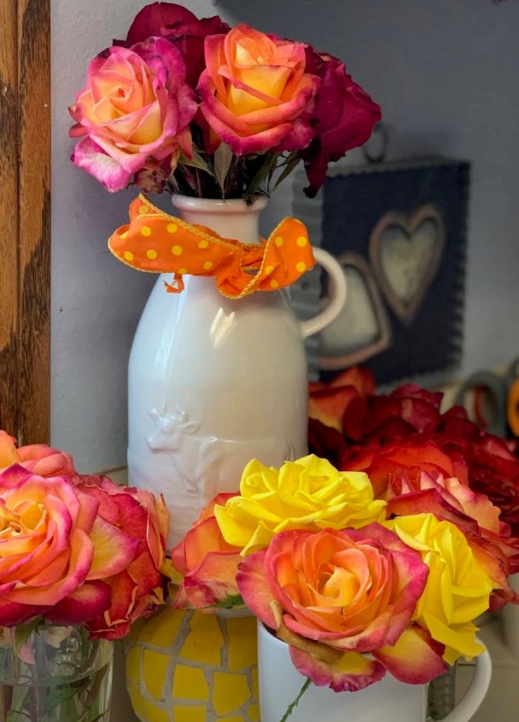 Orange and yellow or black & orange checked ribbons wrapped around my clear glass vases for fresh flowers for the Halloween party