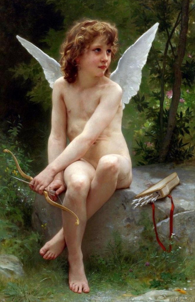 “Boy” by Wm.-Adolpe Bouguereau Romantic French painter $1,000.00 (Gallery – 1st floor) vertical painting -oil on canvas, signature: “W. Bouguereau” created – 1890 on bottom right, width: 30″ x Height 46″ “Amour a l’affut or “Love/Cupid on the Lookout”