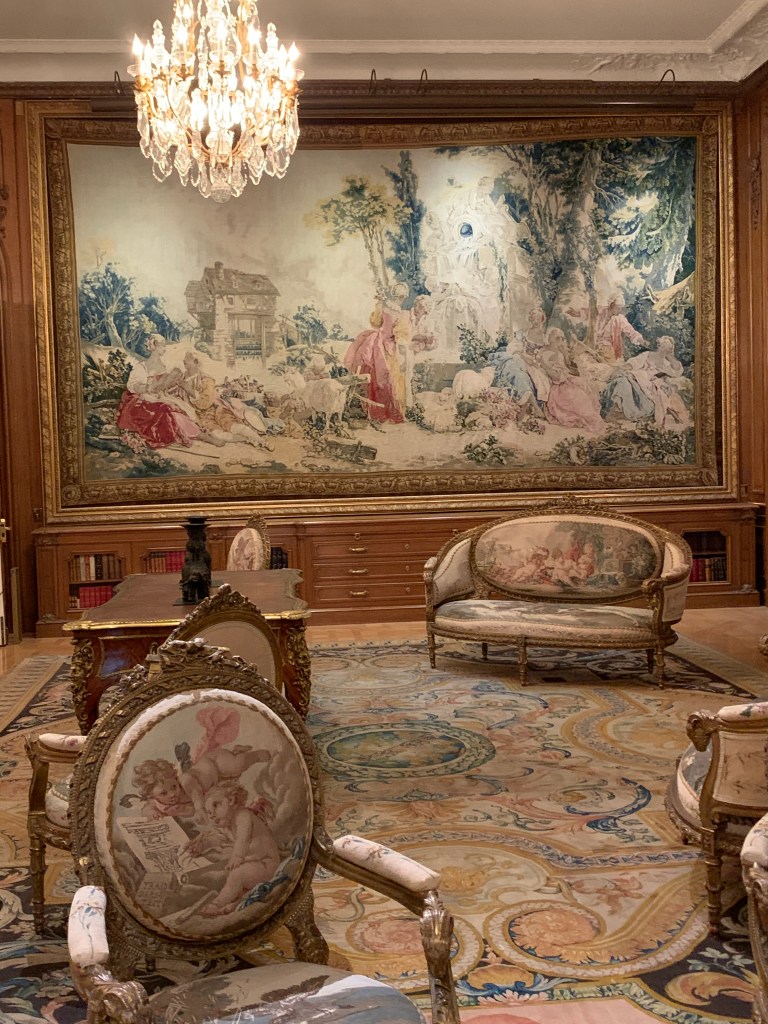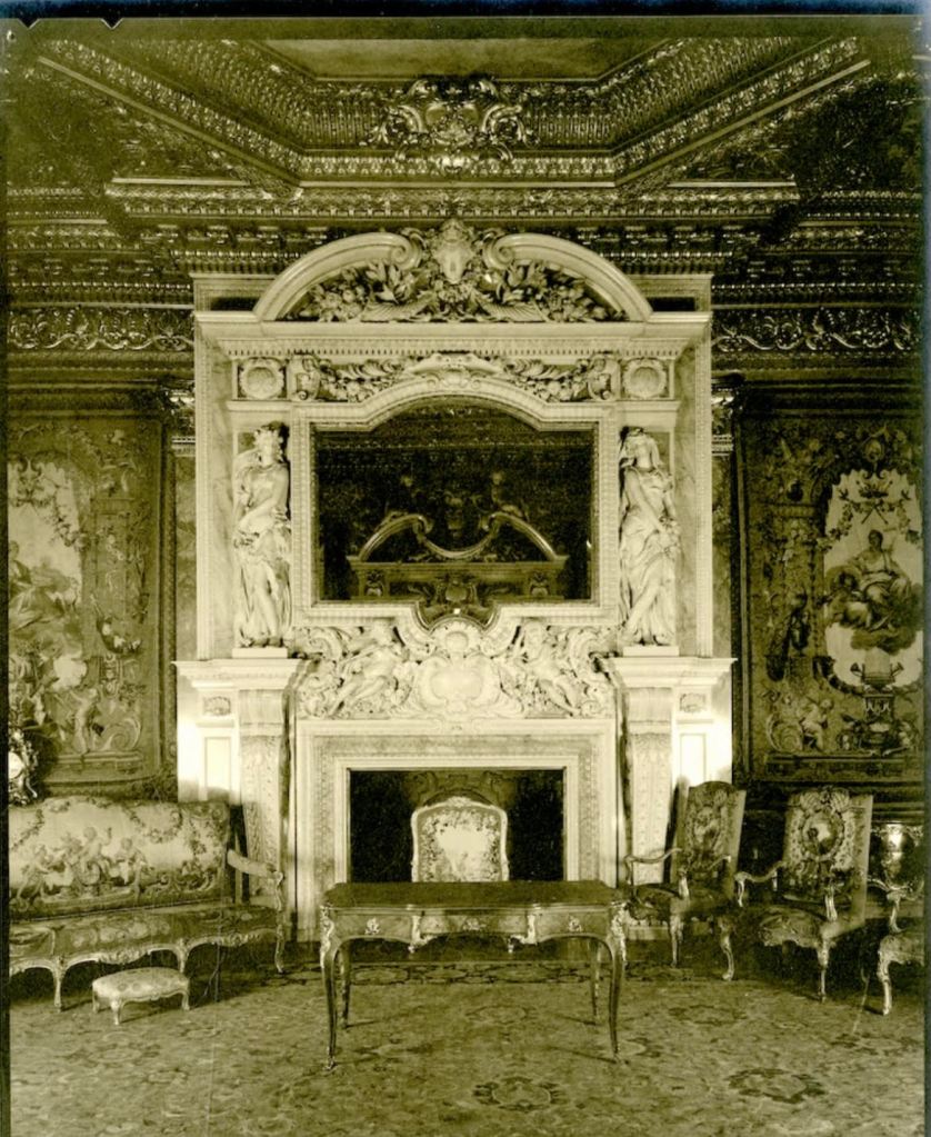 Also, on the ornate white marble fireplace one of many angels sprinkled about this hand-carved white marble mantlepiece. I have read that Ringling Bros. Museum in Florida now owns this amazing piece; when the Huntington Mansion was being dismantled in 1925, Mr. Ringling bought several gorgeous pieces. 2 Boucher-like tapestries flank the ornate white marble fireplace with angels surrounding the main oblong feminine images.