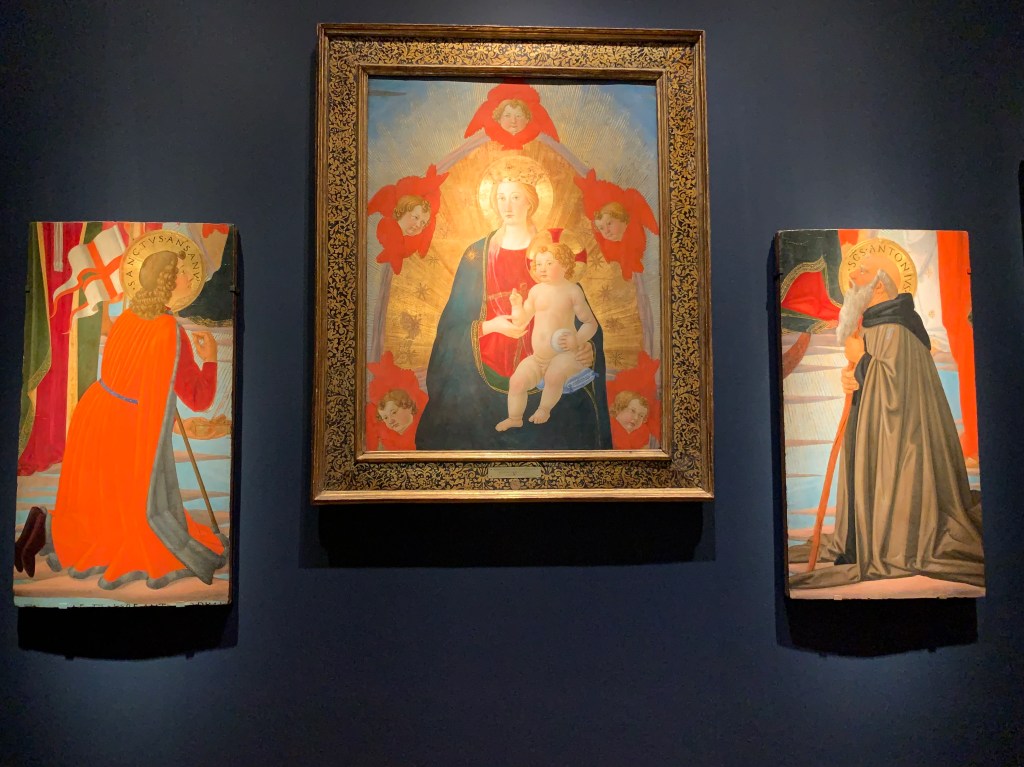 This round painting (above) with a round ornate gold frame carved nuts and pods. The painting is called “Ascension of Young Saint – Louis of Toulouse”? The French saint is flanked by 2 angels wearing lavender flowing gowns on each side of the saint. It is painted by Lorenzo di Credi (1485-1490). Its dimension are 23″ across in a beautiful (Della Robbia- looking wreath) gold frame. It is painted with tempera on canvas & described as “Renaissance circular” paintings. It is now housed at the Huntington Library in San Marino, CA