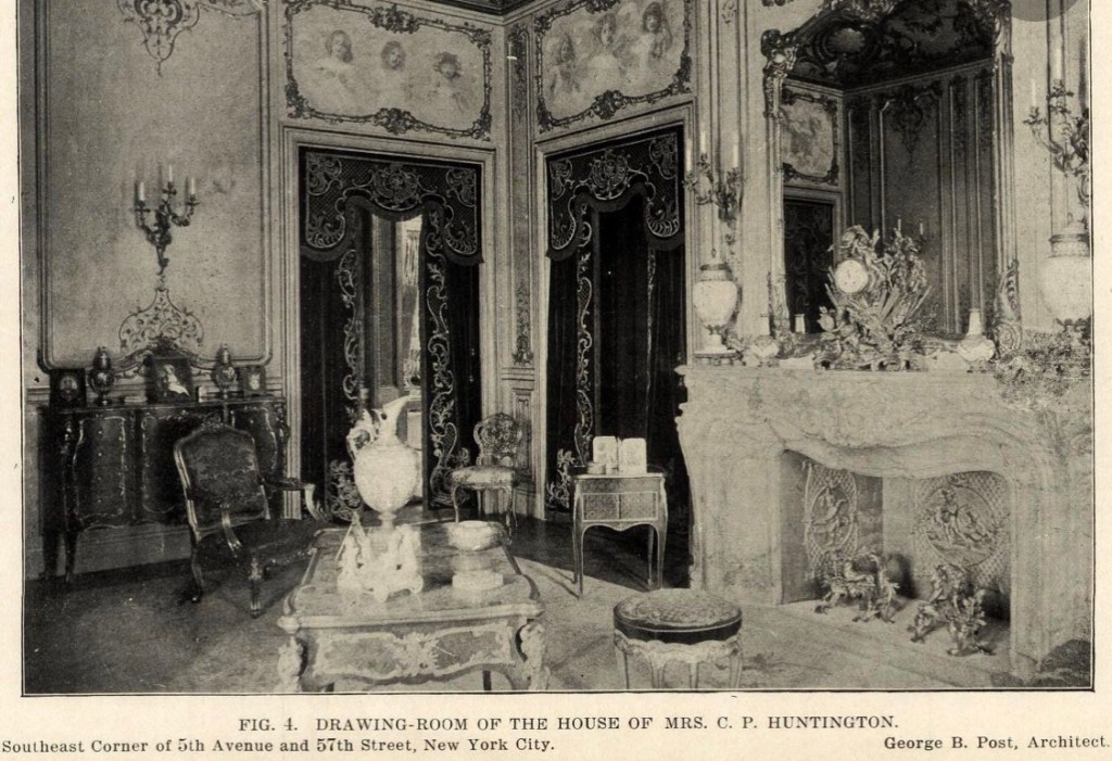 In the 1890’s Collis & Arabella Huntington even commissioned famous painter: Edwin H. Blashfield to paint (fresco- style) on the walls in “White Drawing-Room” – French Salon (No. 2- NYC). There are 6 little angel faces (below in a black & white photo) painted on the walls in “Mrs. C. P. Huntington’s White Drawing-Room” (No. 2), photo taken in 1903 by Architectural Record Magazine. They also published 2 other photographs in the Huntington Mansion, one of the Family Dining-Room and one of the East Salon Room. I was so excited when I found these informative photos.
