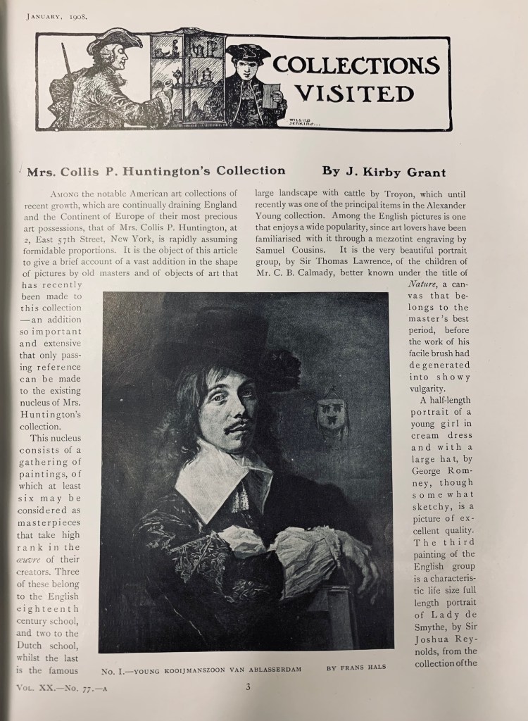 “No catalogue of them was prepared in Mr. Huntington’s lifetime, and he himself would probably have been unable to describe his art collection completely. He bought a picture when he took a fancy to it, and had it sent either to his house in this city [No. 2 NYC], his place at Throgg’s Neck, or to his home [mansion] in San Francisco.”